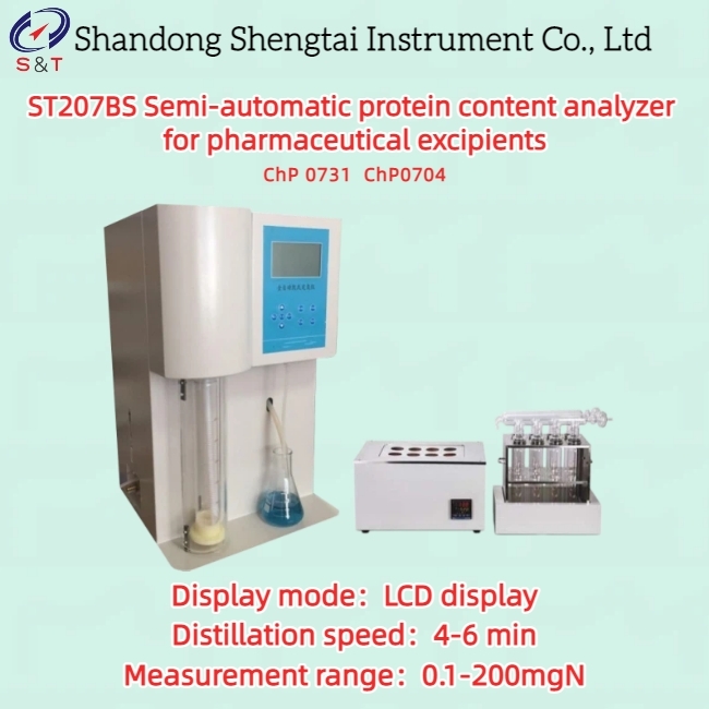 O analisador de teor de proteína semiautomático ST207BS para excipientes farmacêuticos está em conformidade com a Farmacopeia Chinesa de 2020 0704 Método de Determinação de Nitrogênio Terceiro Método Método do Nitrômetro e 0731 Método de Determinação de Teor de Proteína Primeiro Método Método de Determinação de Nitrogênio de Kjeldahl. Adequado para a determinação do teor de nitrogênio em compostos contendo nitrogênio usando métodos constantes e semitracos, usado principalmente para detectar o teor de nitrogênio de proteína em excipientes farmacêuticos, produtos químicos, grãos, laticínios, etc. O processo é controlado por um microcomputador, com ricas informações de exibição, facilitando para os usuários manusearem o instrumento e completarem a destilação de amostras em poucos minutos. Pode ser operado em modos manual e automático, tornando conveniente para os clientes escolherem.