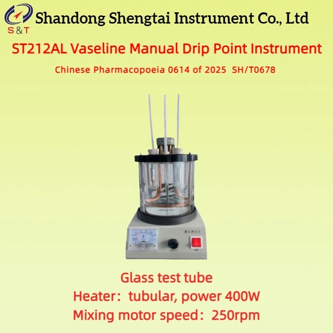 O analisador manual de ponto de queda de vaselina ST212AL cumpre plenamente as normas da Farmacopeia Chinesa 2025, Farmacopeia Britânica,e SH/T0678 "Método de determinação do ponto de queda da vaselina" para a determinação do ponto de queda da vaselina, ou seja, a temperatura a que a vaselina atinge uma certa fluidez no ensaio especificado.
